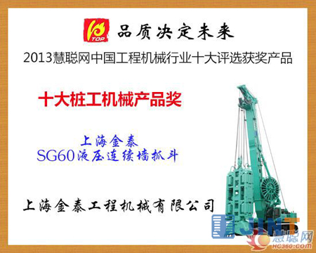 上海金泰SG60液压连续墙抓斗荣登2013年中国工程机械行业十大评选活动的“十大桩工机械产品”榜单。