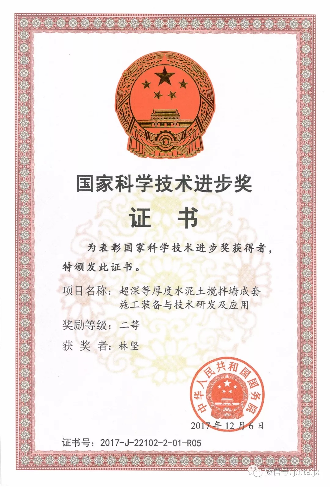 由华东建筑设计院、上海基础工程集团、上海金泰工程机械有限公司等七家单位共同完成的《超深等厚度水泥土搅拌墙成套施工装备与技术研发及应用》项目荣获2017年国家科技进步二等奖。