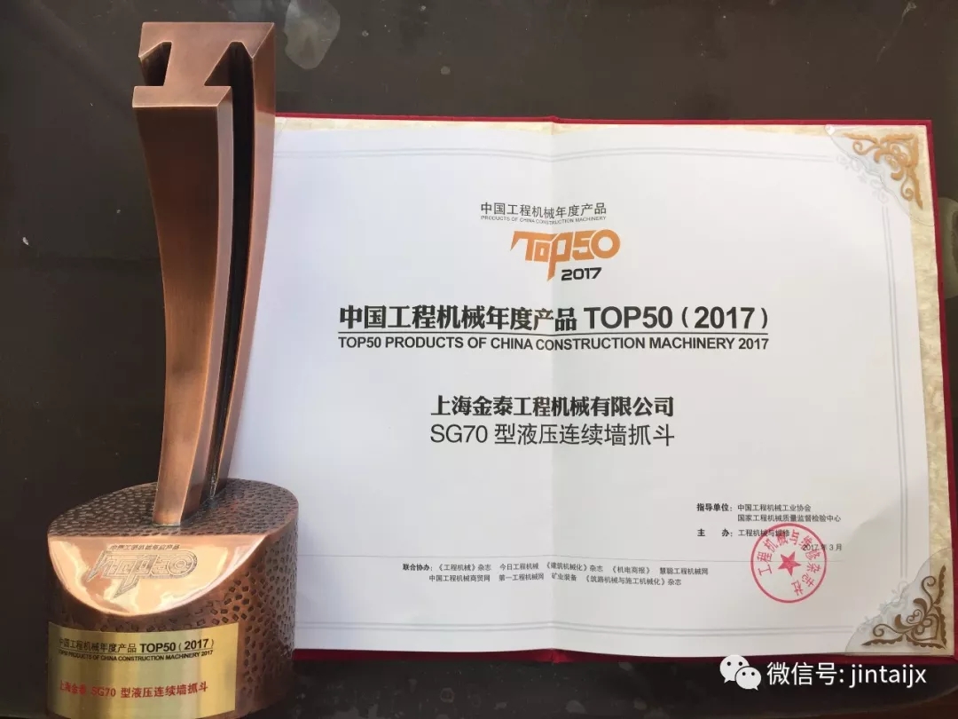 由中国工程机械工业协会、国家工程机械质量监督检验中心指导,《工程机械与维修》主办的“中国工程机械年度产品TOP50”评选展开角逐。上海金泰SG70地连墙液压抓斗荣获“2017中国工程机械年度产品TOP50”产品奖。