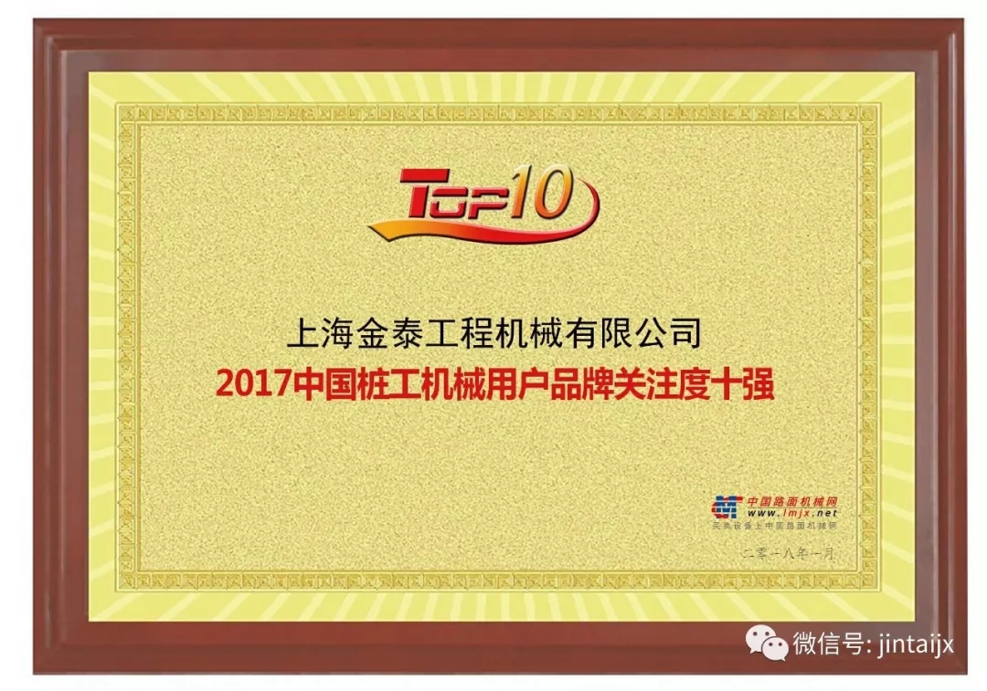 《中国路面机械网》和《工程机械电商网》在北京发布了《2017桩工机械用户品牌关注度排行榜》,“上海金泰”位列品牌榜第四位。该榜单为用户对桩工机械所有品牌和产品的浏览及在线询价次数而生成的品牌关注度指数,较为忠实的反应出终端用户对行业品牌及产品的认知及偏好。