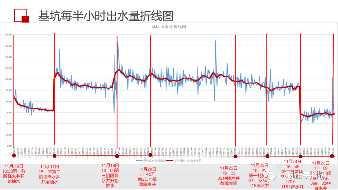 坑内外水位曲线汇总图基坑每半小时出水量折线图